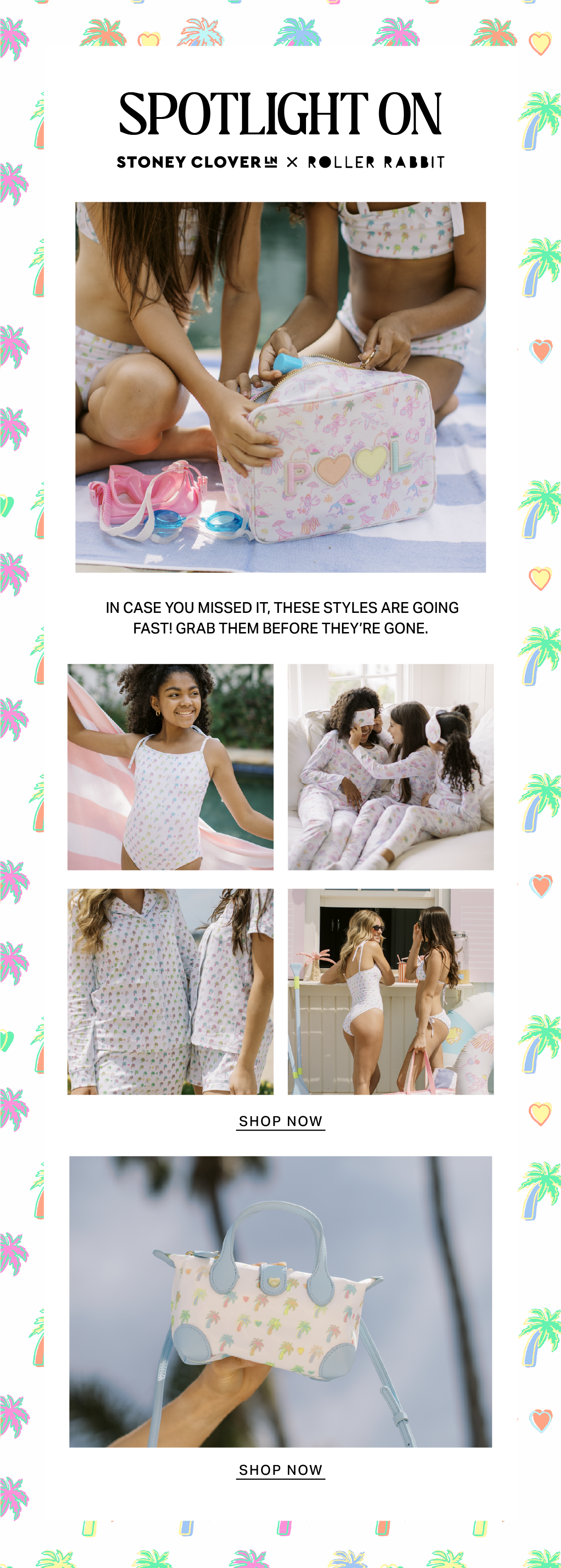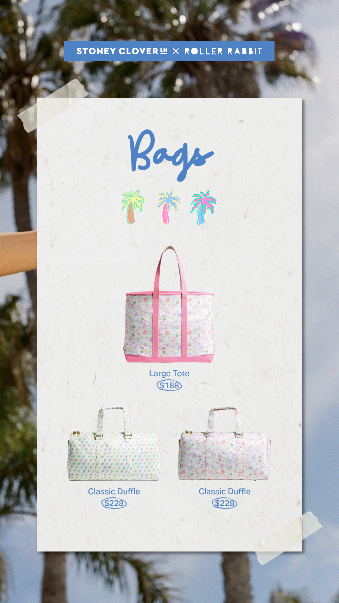 Roller Rabbit is a lifestyle brand known for their iconic sleepwear and vibrant, one-of-a-kind prints that aim to inspire joy, ease, and connection. Sharing a similar mission, Stoney Clover Lane brings color and customization to everyday accessories. This collection marked the third collaboration between the 2 brands, offering new styles while reimagining old favorites. I developed the visual identity for this collection, creating original layouts, fonts, and color palettes for all marketing assets that felt consistent for both brands. I ensured consistency across all brand touch points, including all digital assets, signage, and event displays.